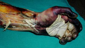 - subdermale Verbrennung, weiß- braune oder schwarze Verfärbung der oft lederartigen Haut